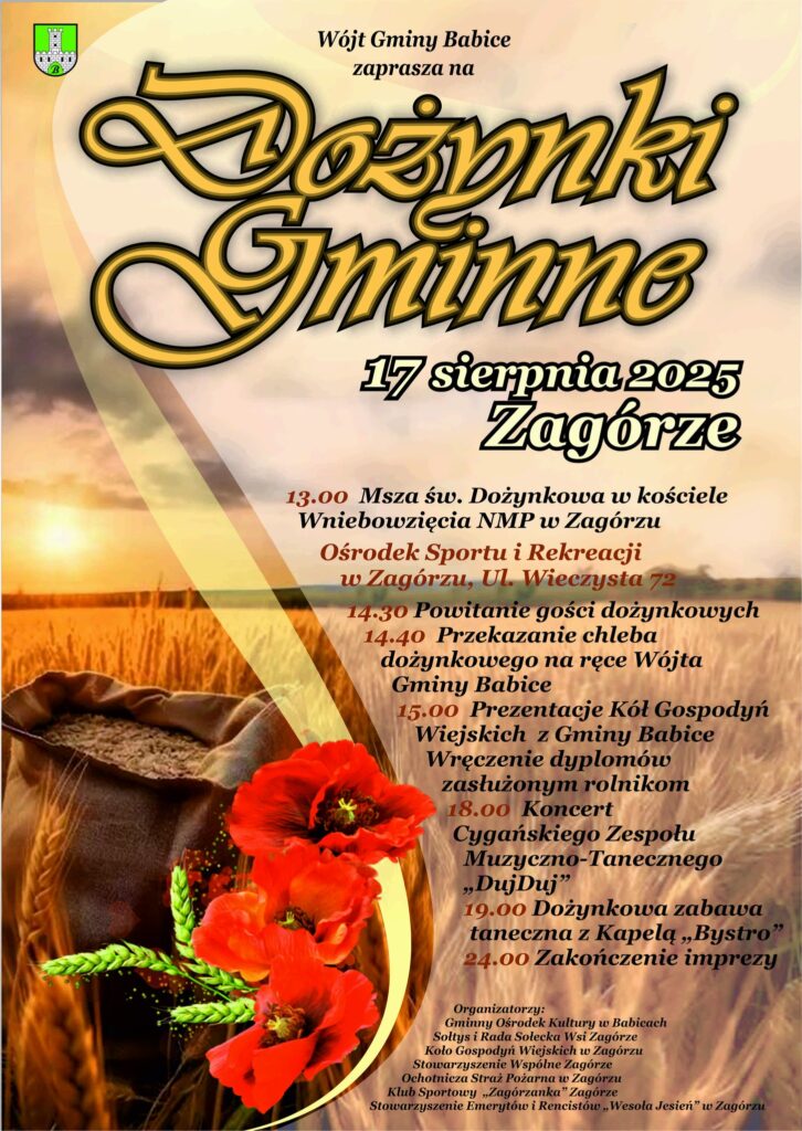 🎊 Dożynki Gmina Babice 2025 w sołectwie Zagórze! 🎊📅 17 sierpnia 2025 spotkacie nas na terenie Ośrodka Sportu i Rekreacji w Zagórzu podczas świętowania tegorocznych dożynek! 🌾 Będziemy z naszą Strefą SWZ – „Ruch zamiast nałogu”, gdzie będzie można spróbować aktywności dla dzieci i dorosłych oraz porozmawiać o zdrowych nawykach i profilaktyce uzależnień 💪😊 Podczas wydarzenia prowadzone będą zbiórki charytatywne dla: