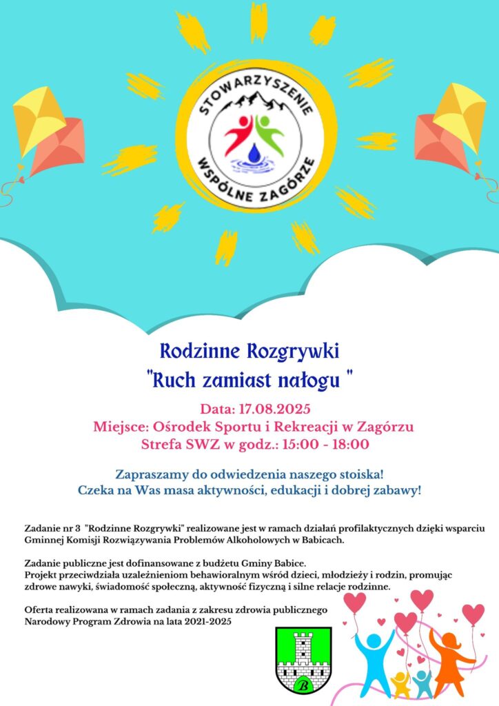 17 sierpnia 2025  na terenie Ośrodka Sportu i Rekreacji w Zagórzu podczas świętowania tegorocznych dożynek w naszej Strefie – Stowarzyszenia Wspólne Zagórze realizowane było kolejne zadanie pt. – Rodzinne rozgrywki „Ruch zamiast nałogu”: Wybiegaj z uzależnienia – wejdź w zdrowie! Była to aktywności sportowa dla dzieci i dorosłych, która zawierała elementy refleksji i edukacji związanej z uzależnieniami behawioralnymi 💪😊  🟢 Projekt dofinansowany z budżetu Gminy Babice, przy wsparciu Gminnej Komisji Rozwiązywania Problemów Alkoholowych w Babicach. 📢 Oferta realizowana w ramach Narodowego Programu Zdrowia na lata 2021–2025.