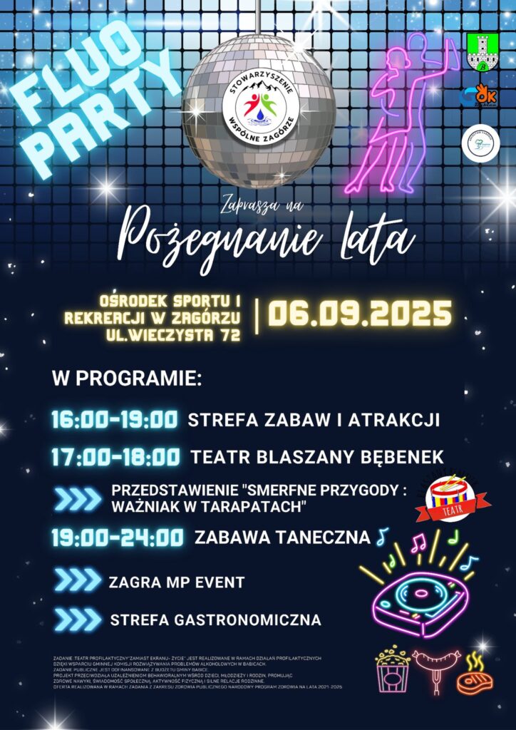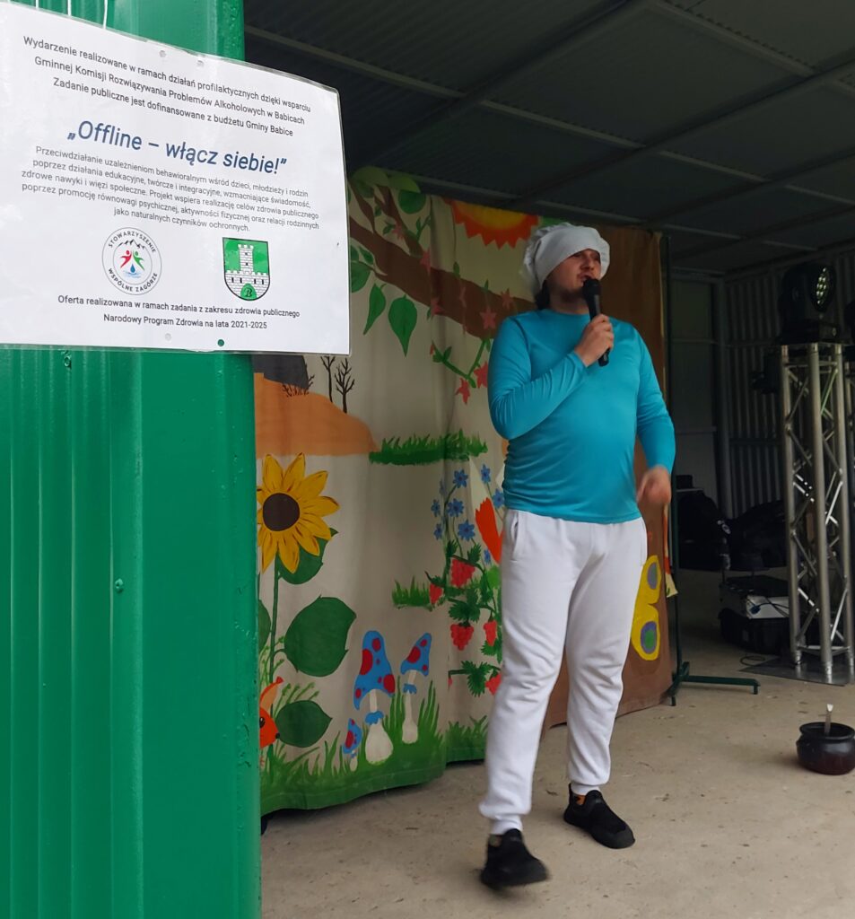 Podczas wydarzenia Pożegnanie Lata – Fluo Party w Ośrodku Sportu i Rekreacji w Zagórzu odbył się wyjątkowy teatrzyk dla dzieci 🎭 Teatr Blaszany Bębenek Blaszany Bębenek zaprezentował przedstawienie „Smerfne Przygody: Ważniak w tarapatach”, które dostarczyło najmłodszym wielu emocji, radości i uśmiechu 💙  Wieczorem rozpoczęła się zabawa taneczna a parkiet rozświetliły kolorowe neony oraz efekty świetlne tworzące fluo party 👉 Zadanie „Teatr profilaktyczny – Zmień ekran na życie!” zostało zrealizowane w ramach działań profilaktycznych, wspierających gminę w rozwiązywaniu problemów alkoholowych i przeciwdziałaniu im wśród dzieci i młodzieży 😊🟢 Projekt dofinansowany z budżetu Gminy Babice, przy wsparciu Gminnej Komisji Rozwiązywania Problemów Alkoholowych w Babicach. 📢 Oferta realizowana w ramach Narodowego Programu Zdrowia na lata 2021–2025.