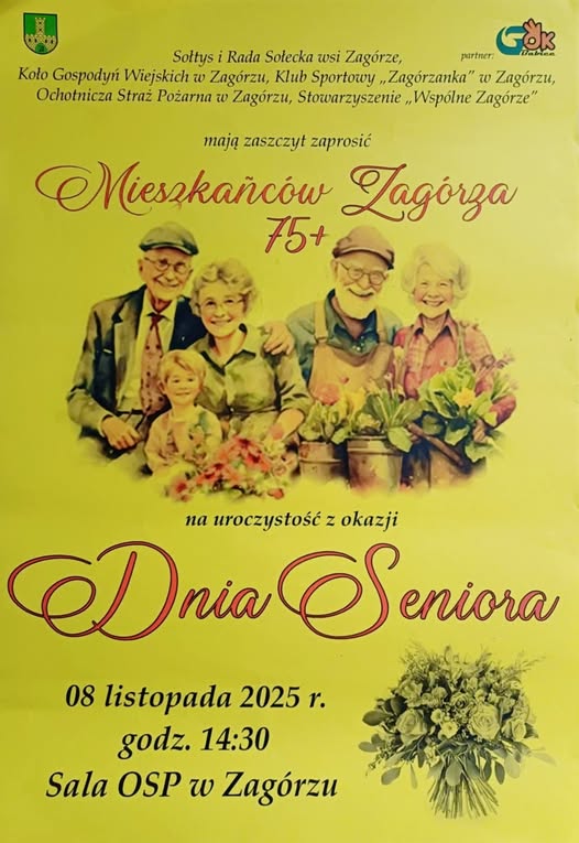W imieniu wszystkich współorganizatorów – Sołtysa i Rady Sołeckiej wsi Zagórze, Koła Gospodyń Wiejskich w Zagórzu, Klubu Sportowego „Zagórzanka”, Ochotniczej Straży Pożarnej w Zagórzu oraz Stowarzyszenia Wspólne Zagórze zapraszamy wszystkich mieszkańców Zagórza 75+ na uroczystość z okazji Dnia Seniora