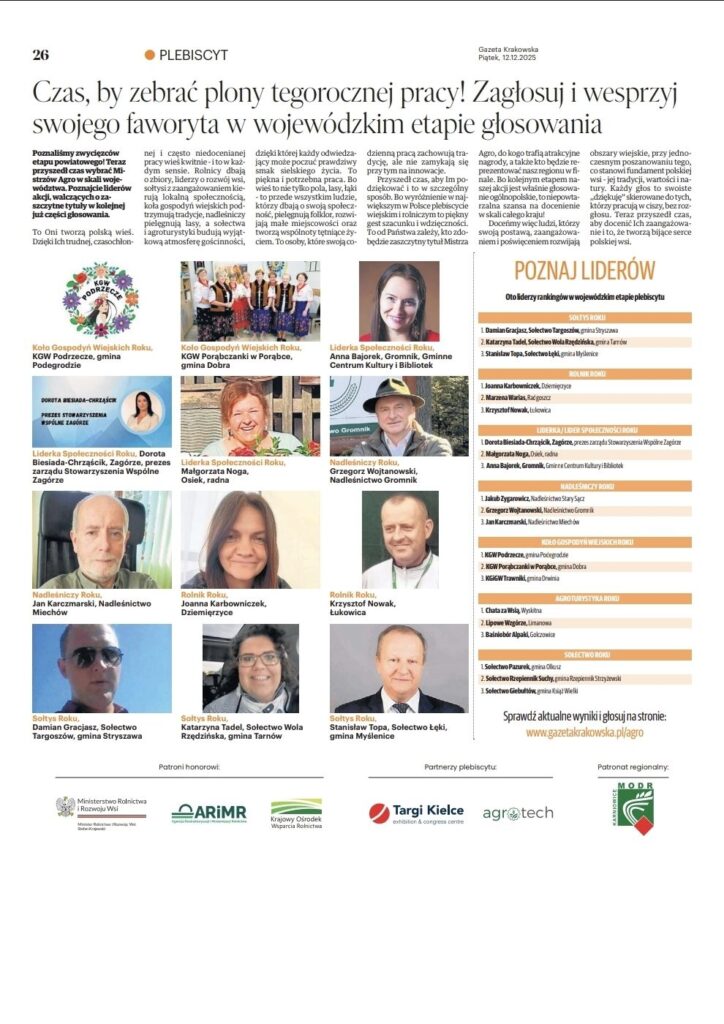 Gazeta Krakowska, że nasza Dorota Biesiada-Chrząścik awansowała do wojewódzkiego finału! Jako prezes naszego stowarzyszenia reprezentuje nas w plebiscycie AGRO na Liderkę/Lidera Społeczności Roku, a także całą społeczność Zagórza. Zachęcamy Was do oddawania głosów i wspierania nas w plebiscycie!