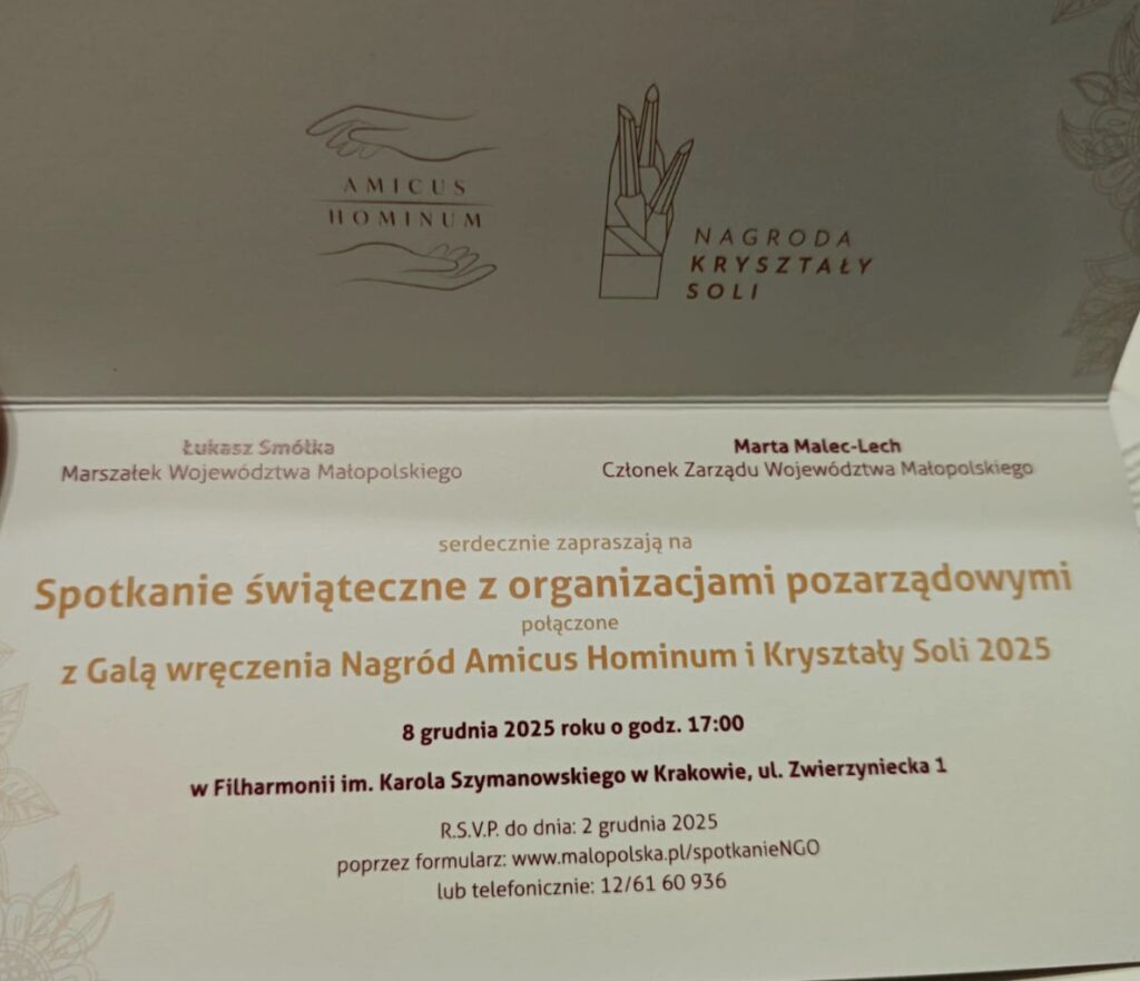 Spotkanie świąteczne z organizacjami pozarządowymi oraz uroczysta Gala wręczenia Nagród Amicus Hominum i Kryształów Soli 2025 w Krakowie. Stowarzyszenie Wspólne Zagórze miało przyjemność uczestniczyć w niezwykłym wydarzeniu, które odbyło się w Filharmonii Krakowskiej